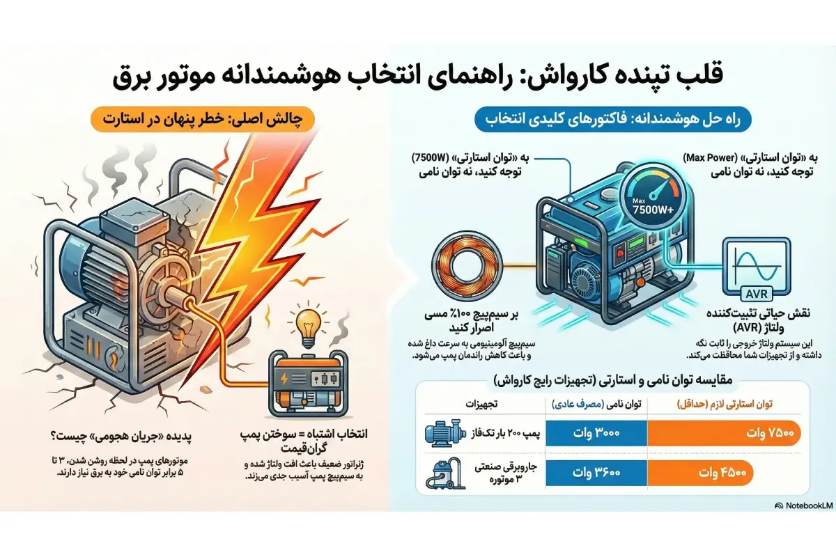تجهیزات کارواش برخلاف وسایل روشنایی یا هیترهای برقی، از نوع بارهای القایی (Inductive Loads) هستند. موتورهای القایی در لحظه استارت نیاز به جریانی بسیار فراتر از جریان نامی خود دارند. این پدیده که به آن جریان هجومی یا Inrush Current گفته میشود، فشاری ناگهانی به ژنراتور وارد میکند. اگر ژنراتور نتواند این پیک لحظهای را تامین کند، ولتاژ به شدت افت کرده و سیمپیچ پمپ داغ میشود. بنابراین، شما نمیتوانید صرفاً بر اساس برچسب توان روی پمپ، موتور برق بخرید. شما به دستگاهی نیاز دارید که “ذخیره توان” کافی برای عبور از لحظه استارت را داشته باشد.